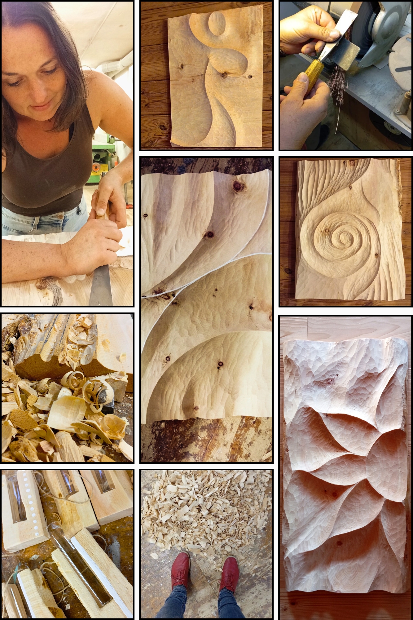 Die Besucher\:innen dürfen in meinem Atelier einen Blick hinter die Kulissen werfen: Zum feinen Duft der Zirbe, den großen und kleinen Werkzeuge, den Skizzen und zu ganz vielen Spänen. Es ist ein stilles, intensives Arbeiten - fast wie geschnitzte Malerei. Ich zeige fertige Werke und Werkstücke in verschiedenen Phasen des Entstehens.