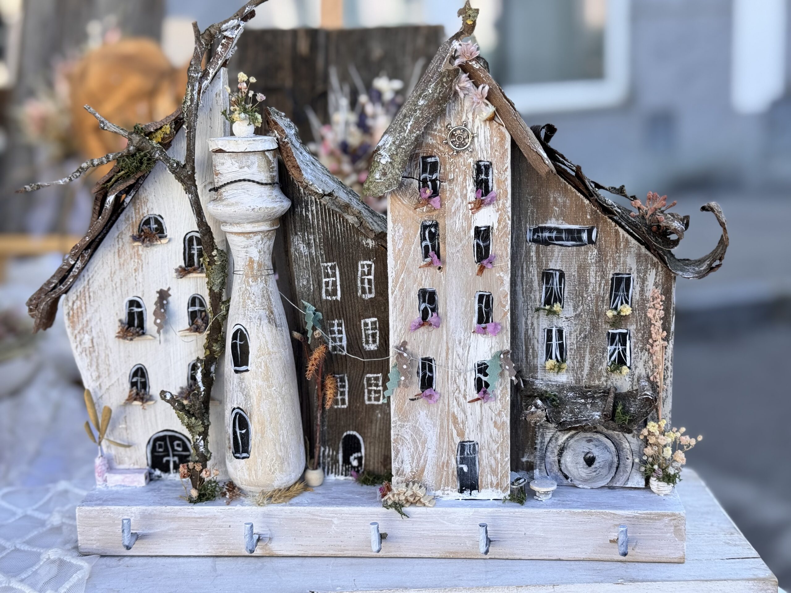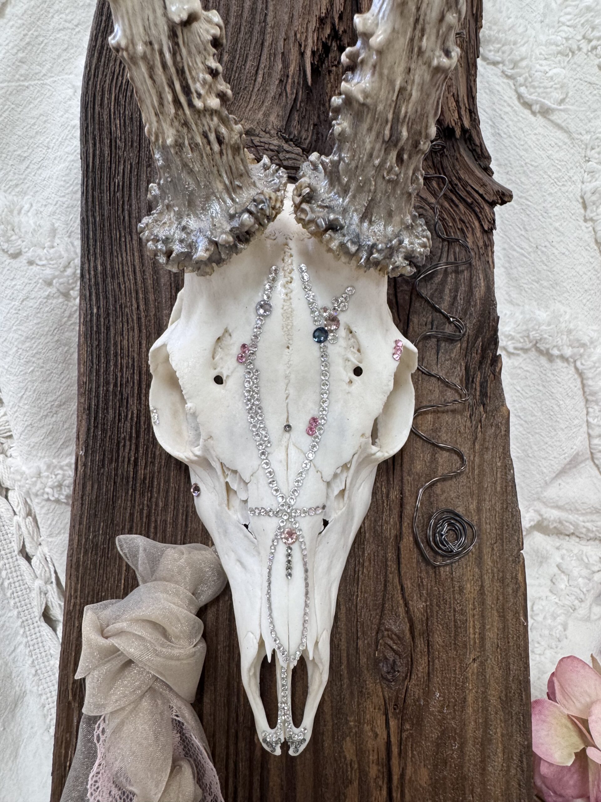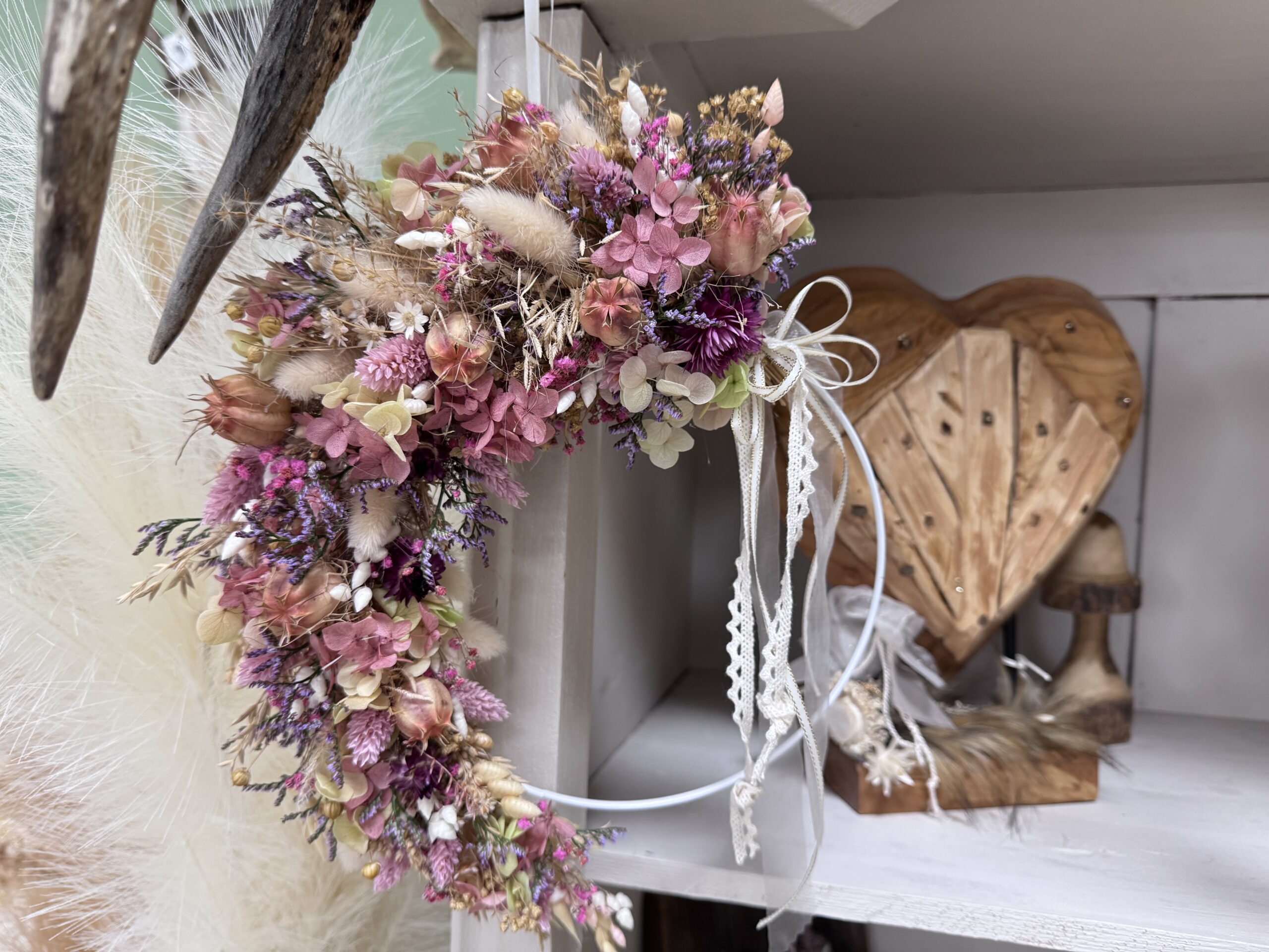 Dazu gehört die abstrakte Acrylmalerei, Reh,- & Hirschtrophäen mit Swarovski Steine veredelt, Althölzer kombiniert mit Hufeisen, Floralringe und ausgefallene Statement Ohrringe.