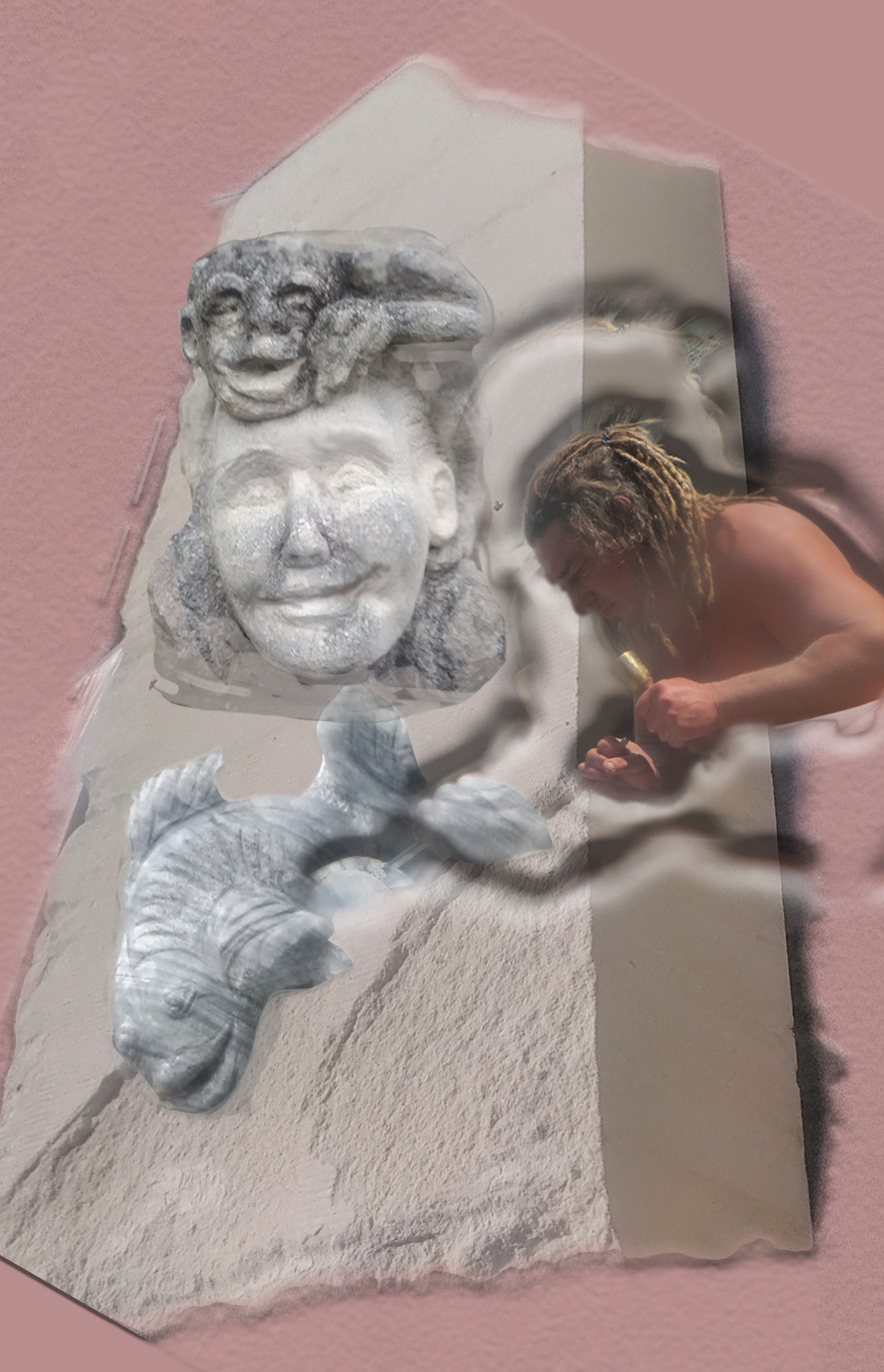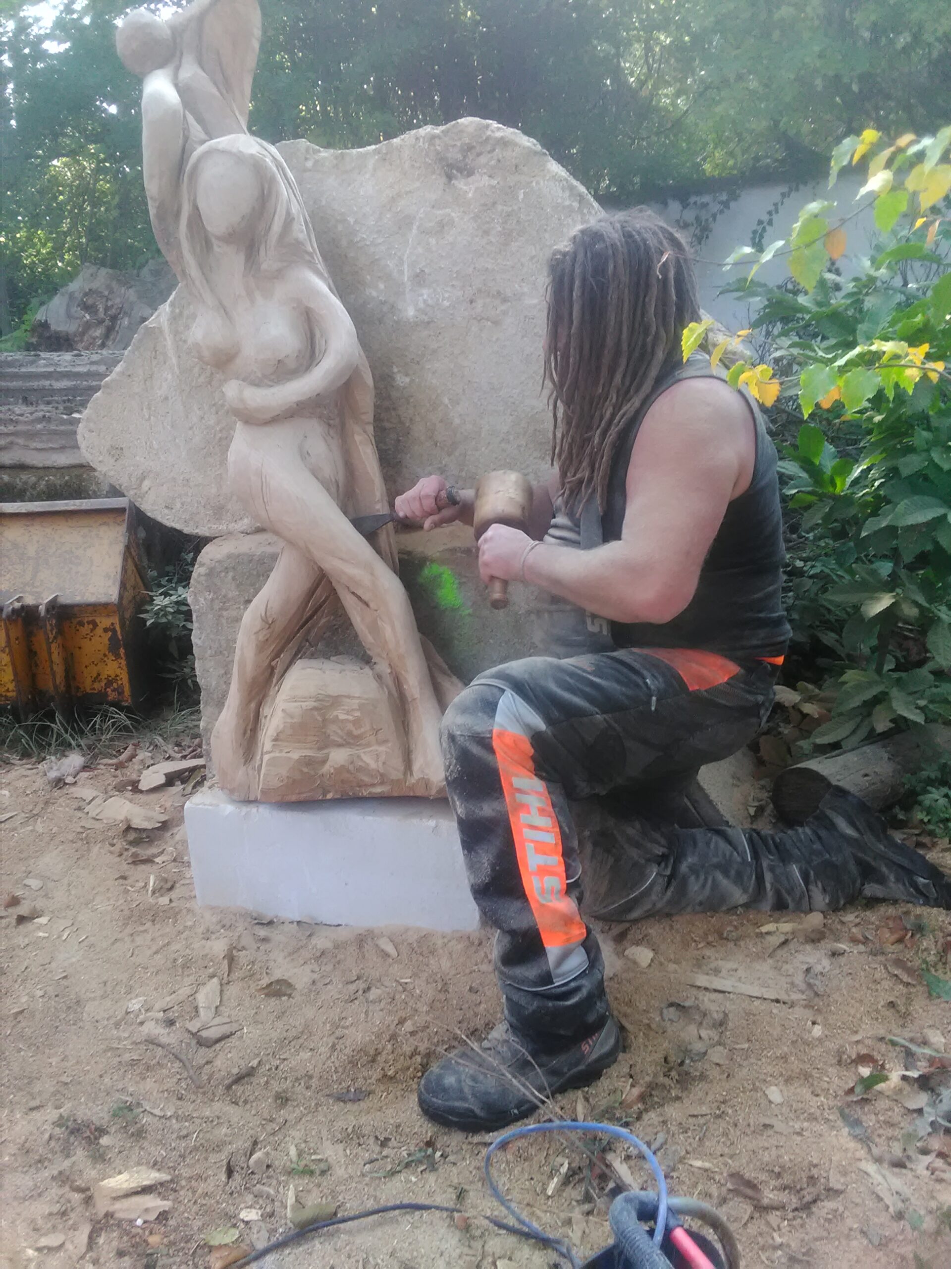 Woodstoneharry zeigt Stein- und Holzskulpturen, Malerei in seinem Kunsthaus mit dem Naturskulpturgarten