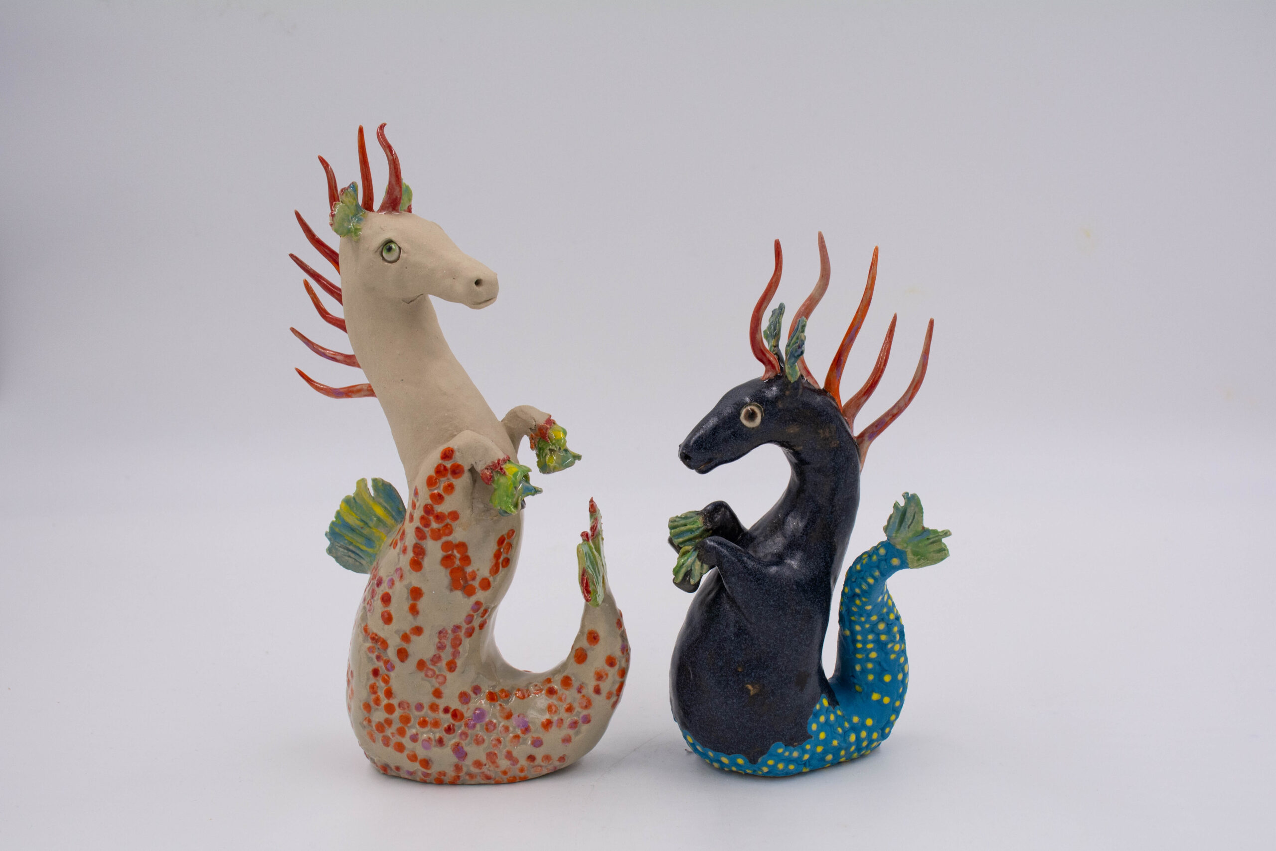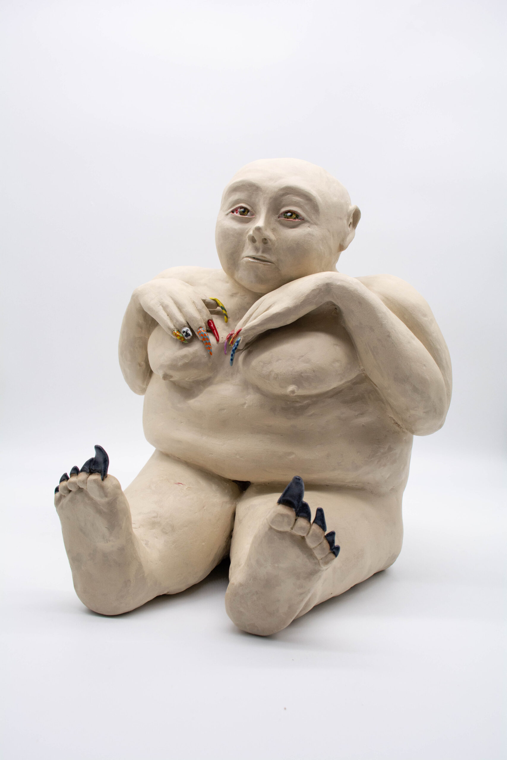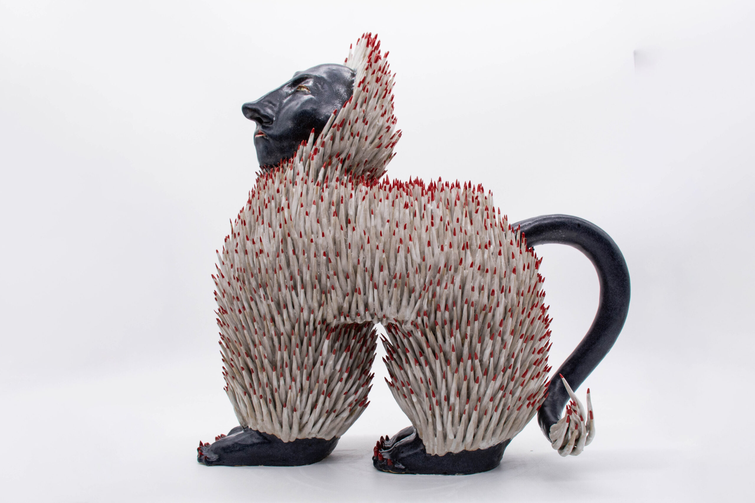 Meine Ausbildung an der Angewandten in Wien und an der Keramikfachschule in Stoob erlauben mir, die stofflichen Grenzen von Steinzeug und Porzellan gezielt auszudehnen. In meiner Arbeit „Ölteppichmantel – Mondfamilie mit Hund“ zum Beispiel, nutze ich diese Erfahrung für die aufwendige Konstruktion des nadelartigen Überzugs aus einzelnen Tonstacheln. Damit setze ich die klebrige Schwere eines Ölteppichs gegen rohe, helle Gliedmaßen, um Versehrtheit und Verletzlichkeit physisch fassbar zu machen und Empörung und Sehnsucht einen Ausdruck zu geben.